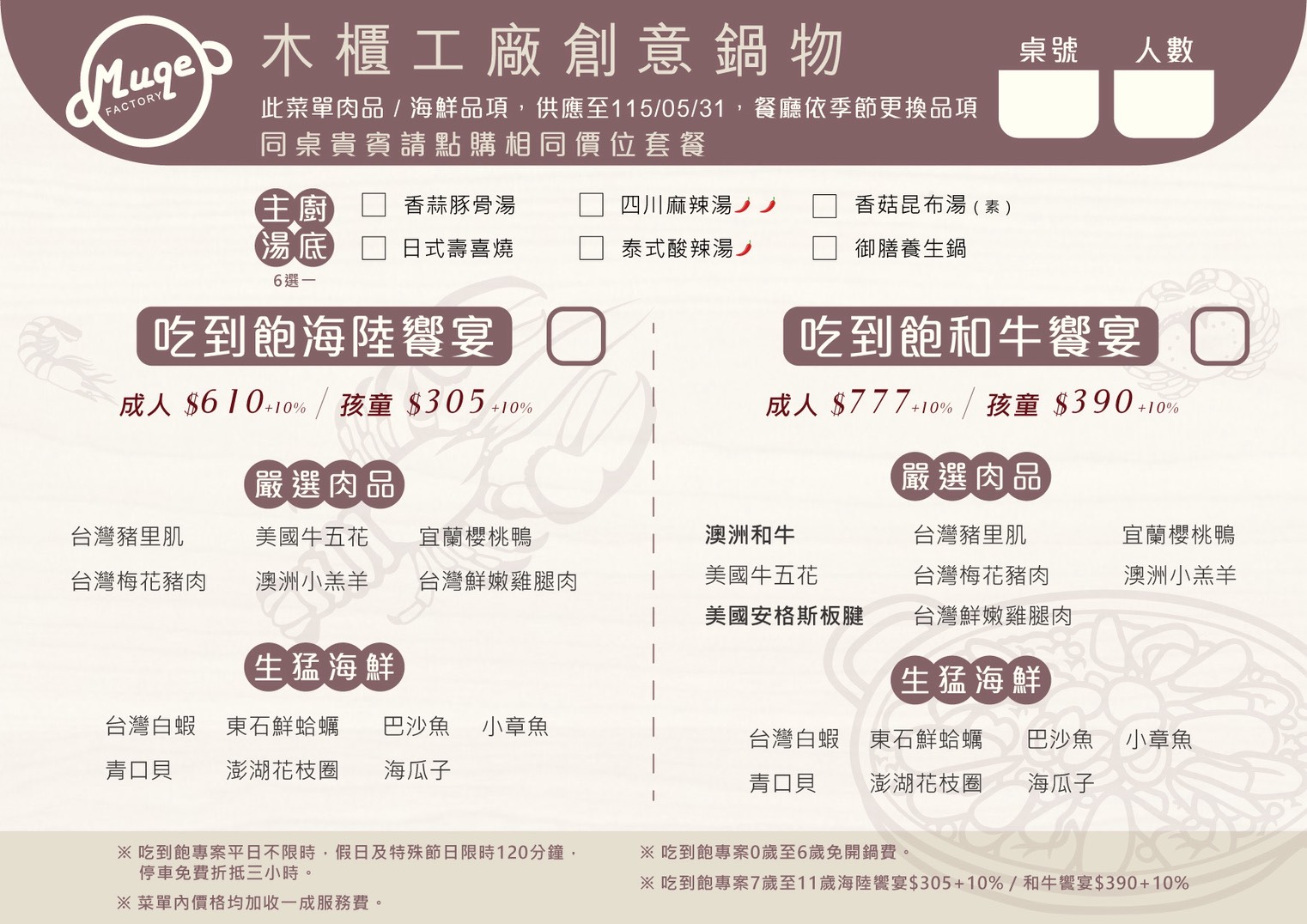 「木柜工厂」以集团两位创办人的名字中,各取最代表性的一字「木与贵」而命名,系为「柜」,木柜代表着大地中素材的承接融合,存放务农的新鲜产物与收藏的珍品,传递执手而聚,自在而简单的美味关系。肉品吃到饱、现捞活虾及台湾产地直送小农蔬食,搭配每日熬煮健康无负担的汤头,以崭新的锅物登场!现场更有多款每日主厨手做甜点,及冰淇淋无限量享用!
